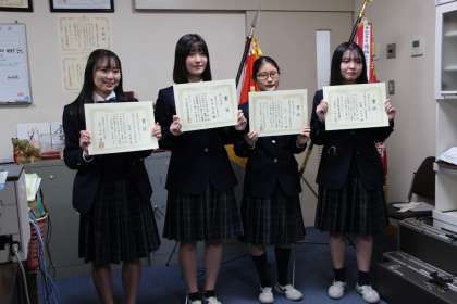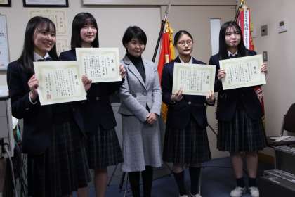 12月16日(金)「税に関する高校生の作文」で優秀な成績を収めた生徒の表彰を校長室で行いました。国税庁では、毎年、「税に関する高校生の作文」の募集を行っています。これは、次代を担う高校生の皆さんが、学校教育の中で学習したことや自分自身の経験・体験などを通して税について考えたことを作文の形で発表し、これを機会に税に対する関心を一層深めるという趣旨で、昭和37年度から毎年実施されているものです。