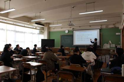 2月8日のLHRの時間に1年次生対象に「越境ワークショップ2」を実施しました。今回は大人の様々な経験を共有し,将来のキャリア形成について自ら考え、選択することの重要性を理解することを目的に本校の教員が12のテーマに分かれて講演を行い,生徒はそれぞれ希望する講座に参加しました。