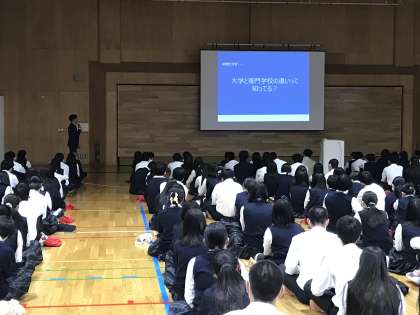 はじめに、進路部長から「キャリアデザイン」についてのお話がありました。キャリア(生き方)に最も大きく影響するのは「人」であること、大学によって育てようとする人物像が異なるため、学校の名前などだけで選ばず、将来の自分の有りたい姿から「何を」「誰と」「どのように」学びたいかを考えることが重要であると学びました。続いて、リクルートの方にお越しいただき、「学校・学部・学科選びのポイント」についてのお話がありました。大学と専門学校の違いや、学部・学科の選び方を6つのポイントに絞ってわかりやすく丁寧に教えていただきました。