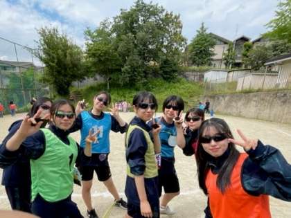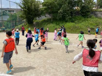 最初の競技は玉入れでした。小学生にとっては高いかごも、高校生にとってはそこまで高くありません。本気で投げていいのか、どう子どもに声をかけようか、まだ迷いが見えていました。その空気が変わったのが2種目目の「ハンターじゃんけん」でした。高校生はハンター役を与えられたのですが、某「逃〇中」のように、サングラスをかけてハンターになった高校生たちはノリノリで子どもたちにどんどん迫っていきました。じゃんけんに勝ったり負けたりで一喜一憂しながら、そこで高校生と小学生の距離が一気に近づいたように思います。