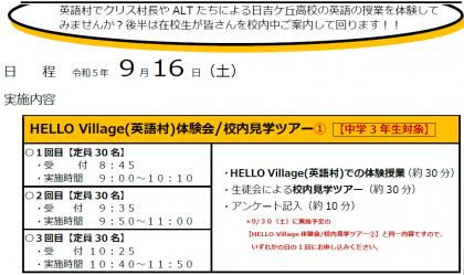 【中学3年生の皆さんへ】9月16日(土)HELLO Village(英語村)体験会/校内見学ツアー(1)のご案内