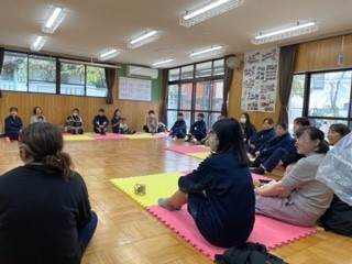 その後、最初の輪に戻って、高校生からお母さんへの質問タイムを行いました。それぞれが楽しそうに交流をしていたように思います。最初は不安そうにしていた本校生も、最後には子どもにつられるように笑顔になっていました。またお母さん方が優しい顔で見守られていたのも印象的でした。本校生にとっては将来の自分たちに思いをはせる貴重な体験になったと思います。今熊野児童館の皆様、どうもありがとうございました。