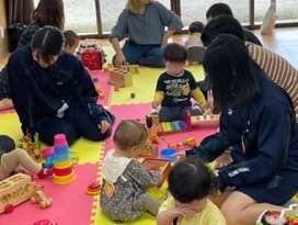 三つ目の体験では実際に乳幼児さんとお母さんの輪の中に入っておもちゃなどで遊びます。一言で乳幼児さんと言っても、お母さんに抱かれたままの赤ちゃんもいれば、お座りして両手でおもちゃを触れる子、もう立ち上がって走り回るのが嬉しくてたまらない子までいろいろです。まずは目を合わせて、声をかけて、おもちゃを使ってそれぞれが自分なりのやり方で子どもに関わっていきました。