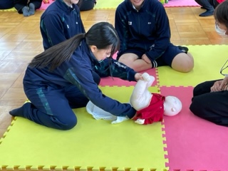 一つ目の体験は大きな重りをおなかに付ける妊婦体験です。ここでは地域の民生委員の方々にお世話になりました。「靴下をはいてごらん」と言われて手を伸ばすのですが、片手は届くのですが、おなかが邪魔で両手で靴下に触ることができません。また、仰向けに寝転んだ時には「おなかが重くて息苦しい」と悲鳴をあげており、妊娠の大変さを実感していました。