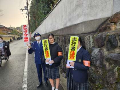 11月24日(金)の朝、東山警察署・東山区役所の方々と本校生徒会執行委員1、2年生で、秋の自転車交通安全啓発・挨拶運動を行いました。