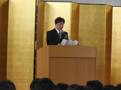 学校長からは「震災、体罰といろんな問題が起こっているが、ひとりひとりの命を大切にしてほしい。きびしい現実にしっかり立ち向かってほしい。」と力強いメッセージが贈られました。生徒会長からはスティーブ・ジョブズの言葉を引用し、「点と点がいずれ線になり、それがいずれ面になる。それを信じてチャレンジして下さい。」と高校2年生とは思えない内容の送辞がありました。
