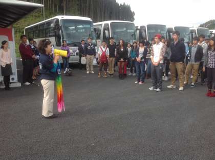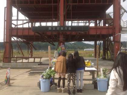 朝から最後の訪問地となる南三陸町を訪問しました。旧志津川駅、防災センターを訪問し、さんさん商店街では、みんなで折った千羽鶴を本来初日に被災体験を語っていただく予定だった芳賀様にお渡ししました。特に防災センターでは最後まで住民を避難誘導をして命をおとされた方をはじめ、震災で命をおとされた皆様の冥福を祈ってお参りをしました。今から仙台空港に向かい予定通りの時間に帰る予定です。