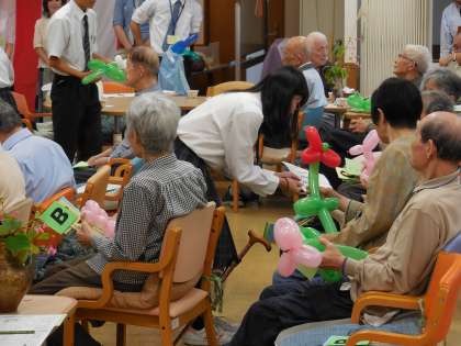 英語村、地域の方々対象のプレイベントとして、9月13日(土)に敬老の日に向けた英語での催し「シニア・デー」を、社会福祉法人「洛東園」にて行いました。本校よりALT3人、生徒会の生徒4人を含む、計14人が訪問し、約30名の利用者の方々が参加して下さいました。