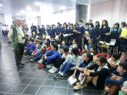 高校生は、小学生にわかりやすく理解してもらうため、工夫をこらし表現の方法に苦心しました。小学生もまた、高校生に質問して発表を一緒に楽しみました。合同授業が終わったあと高校生は振り返り会をもち、博物館館長の大野照文先生からご講評をいただき、今回の経験をこれからの勉強やコミュニケーション力の向上に役立てるよう励ましをいただいきました。