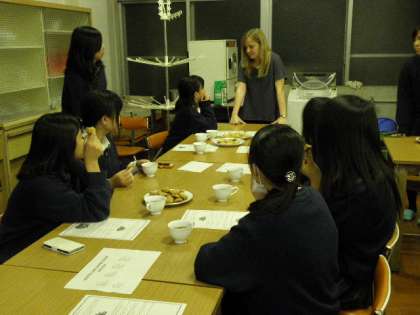11月6日(金)にHELLO Village(英語村)プレイベントの1つとして、ALTのジェシカ先生と出身国のオーストラリアの伝統菓子、アンザック・ビスケットを作るイベントを行いました。ジェシカ先生がアンザック・ビスケットの歴史について話をして下さり、20名以上の生徒が5グループに分かれ、英語の指示を一生懸命聞きながら作りました。完成後は他のALTの先生も交えて、話をしながら楽しくティーと一緒にビスケットを食べました。