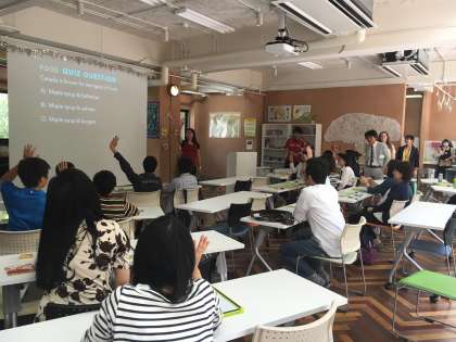 5月14日(土)に本校英語村、HELLO Village における初の一般向けイベント、"CANADA DAY"が行われました。一般の方を中心に参加者約20名で、本校のクリス村長とALTのアラベル先生(どちらもカナダ出身)を中心にカナダの文化等の紹介をクイズを交えて行いました。その後は皆で英語を使っての簡単なクッキング。パンケーキを焼いてティータイムを楽しみました。