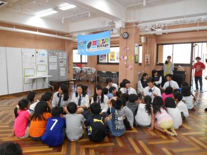 本校、英語村コミュニケーションスペースにて、東山泉小中学校4年生76人を迎えて、今年度最初のキッズ・クラブを行いました。1年次生から3年次生まで23人の日吉ケ丘生がボランティアとして活動に参加し、3人のALTと英語ネイティブの先生とともに力を合わせて元気な小学生と楽しい英語活動ができました。