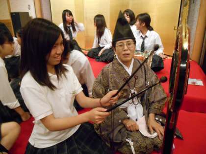 雅楽の歴史や楽器の説明を受け、生の演奏を鑑賞しました。ほとんどの生徒にとってはなじみのない太鼓、鐘、笛の演奏に皆、引き込まれていました。その後、実際にその楽器を体験させていただき、丁寧にご指導いただきました。いろいろな楽器に触れ、実際に音を出したり出せなかったり、楽しい時を過ごすことができました。