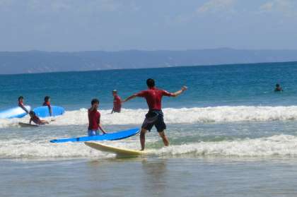 1グループがボート体験等をしている間、もう1グループは、サーフィン体験のため、バスでビーチに移動しました。最初は、3人のインストラクターの指導の下、砂浜でサーフボードに乗るトレーニングをしました。十分にイメージを掴んでから、ライフジャケットをつけて浅い海に入り、まずはサーフボードでうつ伏せになり、両手をつかって漕ぐ練習をしました。初心者がほとんどでしたが、コツを掴めた生徒はあっという間にサーフボードの上に立ち、波乗りを楽しんでいました。私たちが訪れているNoosaは、サーフィンに適したビーチがあり、昨日も、人と犬が1つのサーフボードに乗って波乗りを競うdog surfingが開催されたそうです。ホストファミリーに連れられて、何人かの生徒も見学に行ってきたそうです。初めはうまくできなくても、段々とできなかったことができるようになっていく過程は楽しく、オーストラリア流の余暇の過ごし方を満喫しました。