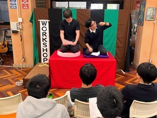 ほかにも”I hate Manju””Traffic Accdident”も鑑賞し、Workshopタイムで生徒がオリジナルにアレンジし、ペアで高座の上で披露しました。