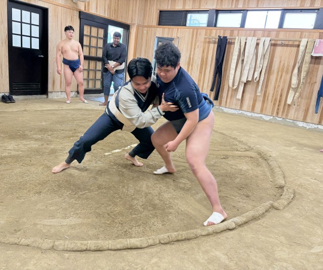 相撲部員が英語と日本語を交えながら相撲の説明を行い、基本的な稽古や土俵上での稽古を実演しました。後半には、留学生に廻しを着けてもらい、実際にぶつかり稽古も体験していただきました。