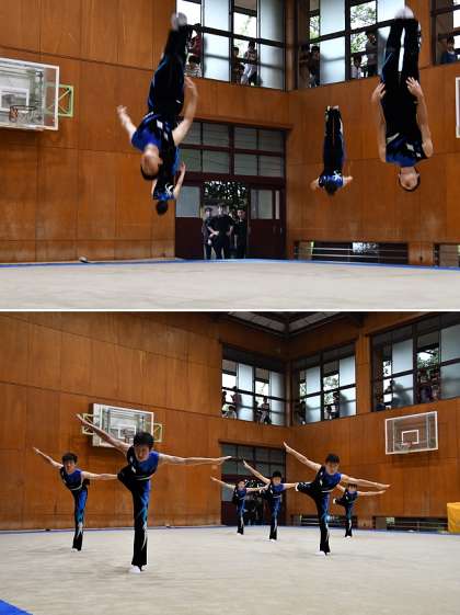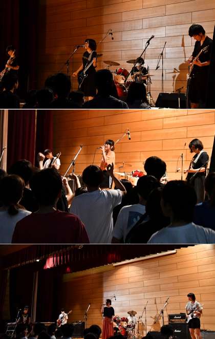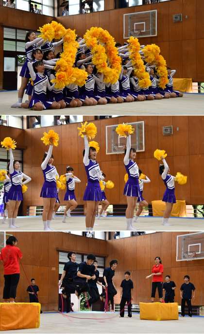 こちらの写真は体育館での軽音楽部のライブ、チアの演技、体操部の演技です。