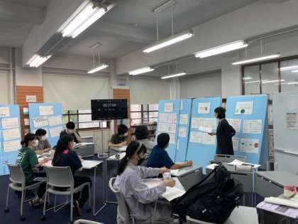 今回は事前に作成したポスターをパネルに貼り付け、他の生徒を聴衆にして自分の研究内容を5分にまとめて説明するという、半年の集大成となる活動でした。
