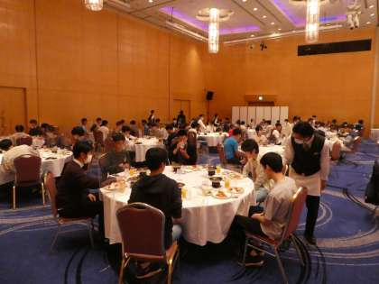 大宴会場での夕食ではホテルからのサプライズ映像もあり、たくさん運ばれてくる料理を美味しくいただきました。黙食が基本ですが、クラスメイトと食卓を囲みながら長旅の労も癒やされたことと思います。一日本当にお疲れ様でした。