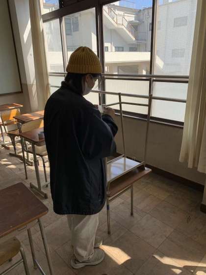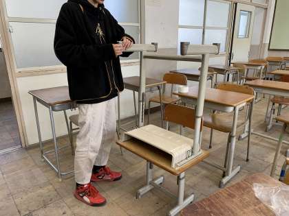 生徒大会で「教室の机やイスがガタついている」という意見が出たので、全校生徒で点検したところ、補修が必要な机やイスがあったので、テープを巻き付けて多少のガタつきは解消できました。また、不備のあるイスもあったので交換しました。