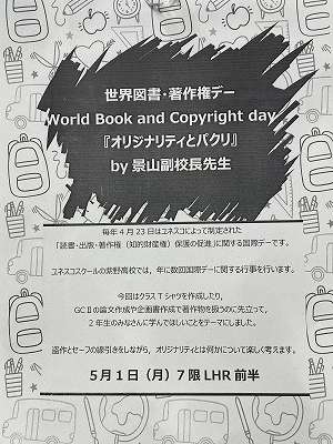 4月23日の「世界図書・著作権デー」に関連して、5月1日(月)のロングホームルームでは、著作権をテーマに景山副校長先生による特別講座が開催されました。