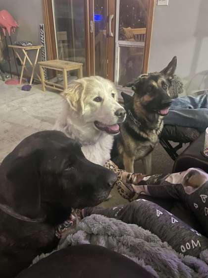 【写真右】最近ホストファミリーが新しく迎え入れた5ヶ月のグレートピレニーズ(真ん中の白い犬)。遊ぶのが大好きで、帰宅すると飛びついてきます。