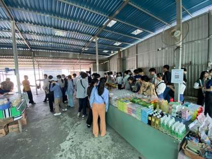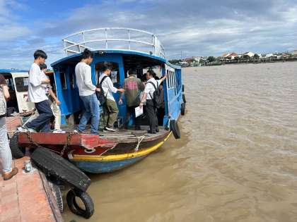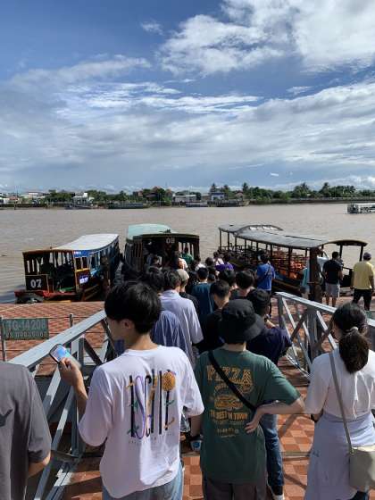 まず、大きなボートで中州に移動します。そこで名産品のココナッツを加工したお菓子やフルーツの試食がありました。美味しいと思ったお菓子を各々土産に購入したり、新鮮なフルーツを音楽の生演奏を聴きながら食べて、ジャングルクルーズの出発まで暫し待機です。