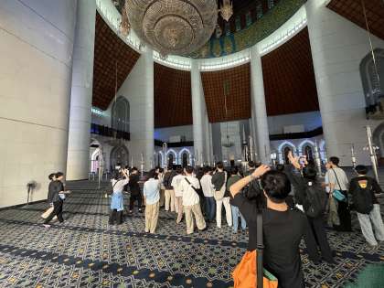 本日朝8時15分(現地時間)にホテルを出発し、ブルーモスクへ。ブルーモスクでは、イスラム教の祈りの方法や、イスラム教の文化について学びました。ブルーモスクを堪能した後はバングリス村を訪問しました。バスを降りると村の方々が太鼓の演奏で出迎えてくださいました。村の見学ではゴムの収穫体験、アブラヤシ畑の見学、コーヒー豆の加工体験を行いました。見学が終わると事前に決めていた班に分かれて村のお家にお邪魔させていただきました。お家では、その家庭の人々と共に手を使った食事をしたり、伝統衣装を着たり、マレーシアの伝統的な遊びを教わったりしました。村からホテルに戻った後はマレーシアで働く日本人の方々のお話を聞きました。とても面白い体験談ばかりでした。ありがとうございました。初日に不安そうな顔をした生徒が多かったように感じましたが、2日目で文化の違いや人の温かさに触れ、少し不安が和らいだように感じました。明日の活動も全力で楽しみましょう!