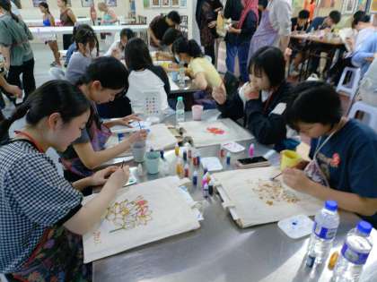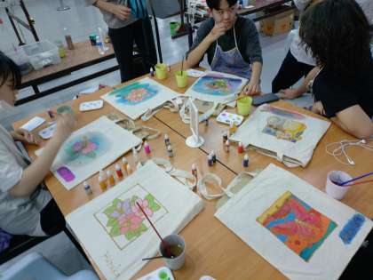 バティックとは、マレーシアの伝統的なろうけつ染め。溶かしたろうで輪郭線をなぞると、ろうが固まり、そこだけ染料が乗らなくなります。生徒たちは、めいめい花や動植物の輪郭線が描かれたトートバッグを、ろうを垂らす特殊なペンで四苦八苦しながらなぞり、その後は色を混ぜたりグラデーションを駆使したりしながら、各々のこだわりを表現した作品を作りました。