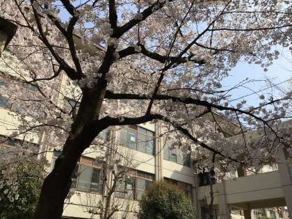 写真2枚目:新入生の学び舎(北校舎)と満開の桜