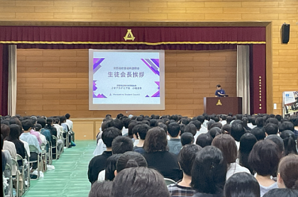 吹奏楽部とチアダンス部によるウェルカム演目の後、普通科に在籍する2年生生徒7名が「紫野高校生の1日」「学校行事」「修学旅行」「志望理由と受験勉強」をテーマに、紫野高校での学校生活を通して感じた紫野高校の魅力について紹介しました。またこの春に卒業し府内の大学に進学した本校の卒業生から、高校時代に得られたことや紫野高校の経験で大学生活に役立っていることなどについて、分かりやすく紹介してくれました。