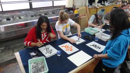 今日は、3年生の書道の授業にシュバリエ校の生徒が参加をしました。本校生徒たちも英語を使いながら筆運びの順番を教えたり、文字の意味を教えたりして、楽しく交流学習を行いました。シュバリエ校の生徒は思い思いの字を書き、カタカナや漢字で自分の名前を記して完成させました。