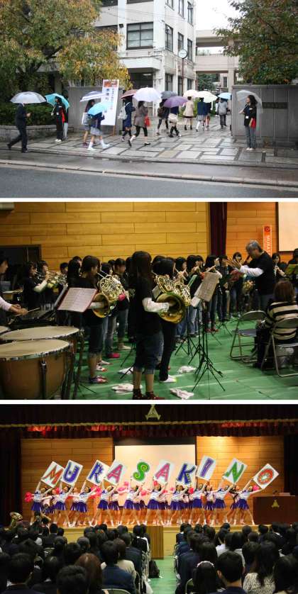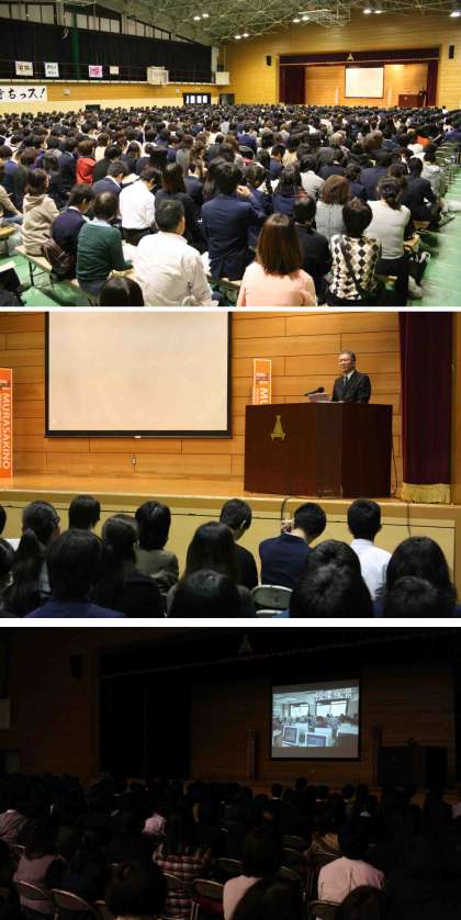 野球部、生徒会、女子バスケットボール部の生徒による出迎え、受付、誘導により会場に入っていただき、オープニングとして、吹奏楽部の演奏、アメリカンフットボール部チアの演技で歓迎いたしました。司会は、放送局の生徒が担当しました。