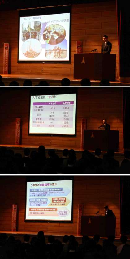 学校長あいさつの後、企画推進部主任より普通科の概要、教務主任より教育課程・入試選抜、進路指導主事より進路指導・進路結果をご説明いたしました。また放送局の生徒が制作した学校紹介VTRで、生徒の学習や行事、クラブ活動の様子をご覧いただきました。