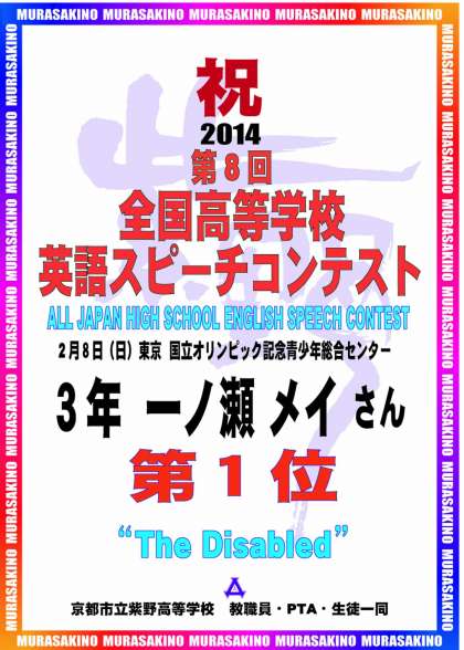 2月8日(日)東京、国立オリンピック記念青少年総合センター大ホールで開催された「第8回全国高等学校英語スピーチコンテスト」において、近畿ブロック代表として出場した本校3年生の一ノ瀬メイさんが、見事、第1位となりました。