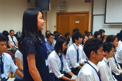 全体の発表は、塔南高校の生徒が行い、その後参加者一人一人が自分の所感を発表していきました。イギリスで出会ったのはネイティブだけではなく、英語を学びに来ていた他の国の学生との触れあいもありました。特にイタリア人学生との交流が印象に残った生徒が多かったようで、その話が出ると会場が大いに盛り上がっていました。