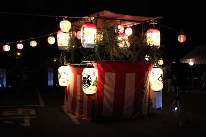 今年の大踊りのやぐらの四隅には、9月1日の総合的な学習の時間に京都産業大学の学生さんと提灯の小嶋商店さんの指導の下、本校2年生と人づくり21世紀委員会の皆さんとで、四季を感じさせる様々な素材を和紙で貼りつけて作った提灯が飾られました。また、会場の周囲にも、昨年度の授業で作成した和紙の行灯が飾られ、会場の雰囲気を盛り上げていました。