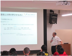 前半は高校での学びと大学での学びの違い、理学・工学・農学それぞれの目標とするものなどについてのお話で、理系の大学に進学する生徒には聞いておいてほしい内容でした。後半は工芸繊維大学について、各学科の研究内容、卒業生の進路、入試制度や授業料などについてもお話をしてくださいました。