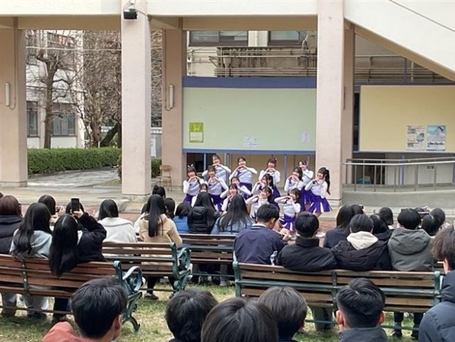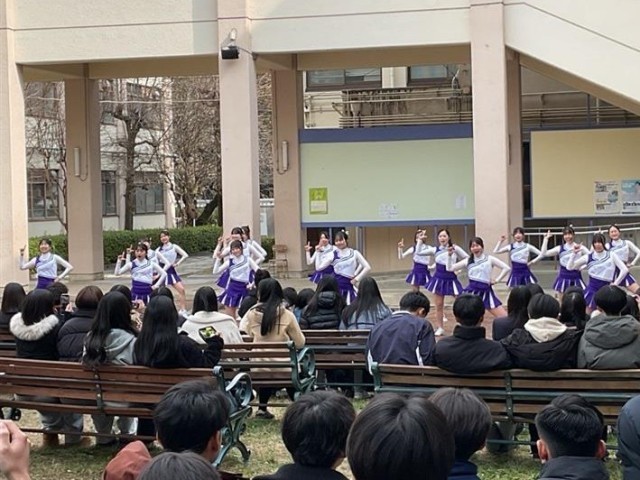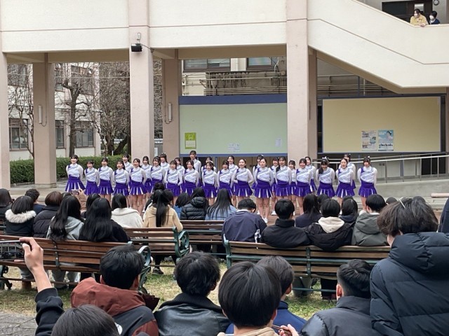 2月12日(木)、チアダンス部が中庭でバレンタイン演技をお披露目しました。 部員たちは寒さにも負けずこれまでの練習の成果を発揮し、観客のみなさんへ可愛さと活発さあふれるパフォーマンスをお届けしました。 演目は代々チアダンス部で受け継がれてきた2曲で、1年生は憧れの演技をついに自分たちが踊ることに胸を弾ませつつ、緊張を乗り越えて見事に踊り切りました。2年生も、去年よりもいっそう洗練された演技でこれまでの成長を観客のみなさんへ伝えました。
