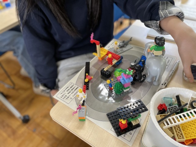 さらに、生徒たちは自分が選んだ動名詞を、ブロックを使って作品として表現しました。言葉だけで考えるのではなく、形にしてみることで、「自分にとってその動きとはどんな場面なのか」「どんな感じがするときに、その動きが表れているのか」を、より具体的に考えることができます。同じ「支えること」でも、安心できる場面を思い浮かべる人もいれば、誰かの背中を押すような場面を思い浮かべる人もいます。作品を通して語ることで、一人ひとりにとっての意味の違いが少しずつ見えてきました。