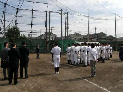 野球部の秋季京都府大会優勝をうけて、京都市教育委員会の高桑教育長が野球部員を激励にお見えになりました。部員ひとりひとりに優勝のお祝いと近畿大会に向けての激励をいただきました。代表して主将がお礼と今後の抱負を力強く述べました。