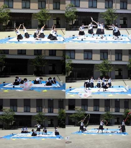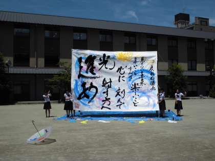 また,今回は,「穂美月展」第30回を記念して,7月14日(土)午後1時から,本校書道部による「書道パフォーマンス」も行われました。会場すぐ東の京都堀川音楽高校グラウンドにて,文字通り炎天下のさなかに,元気よく流れるような動きで作品を創り上げていました。