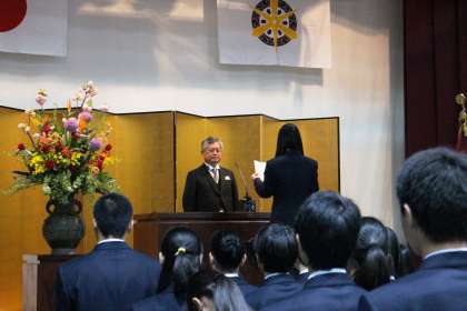 最後になりましたが,高い所からではございますが,保護者の皆様に一言御挨拶申し上げます。本日は,お子様の御入学誠におめでとうございます。高校三年間は,人生の方向を決定する大事な時期です。私たち教職員は,お子様が自ら生きる道を切り拓いていけるよう,全力を尽くしてまいります。お子様の健全な成長を望み,豊かな個性を育てていくためには,学校と家庭がそれぞれの役割を果たしながら,連携を密にしていくことが重要であると存じます。学校の方針を御理解いただき,御支援と御協力を賜りますよう,お願い申し上げます。