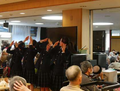 冬の童謡メドレー、津軽海峡冬景色、川の流れのように、男の勲章、などの曲を歌や踊りも交えて演奏しつつ、子ぎつねこんこんの手遊びやふるさと斉唱も行い、施設の高齢者の方に楽しんでいただきました。