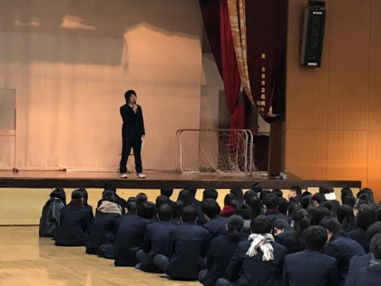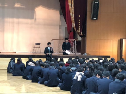 吉田進路指導主事は今年のセンター試験の概況説明、伊藤学年主任からは最後まであきらめずに受験勉強に取り組むために、納得した出願先を決定してほしいとお話しされました。
