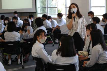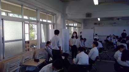 普通科3年生のコミュニケーション英語の授業では,2クラス合同授業をAL2・3教室を使用して実施しました。9.11について2時間通して学んだ後,それぞれが考えた"What is real courage?"等の題材について,グループディスカッションをおこない,その後,クラスを開放して英語で共有し,更に考えを深める学習活動を展開しました。