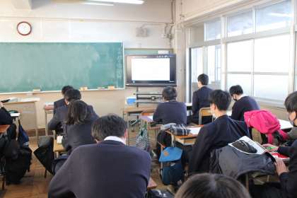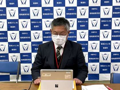 はじめに,湯川進路指導主事からの最終注意の後,小野学校長,田中学年主任からの激励が行われました。画面越しでも,対面と変わらない心のこもった激励のメッセージが,生徒たちに伝えられました。