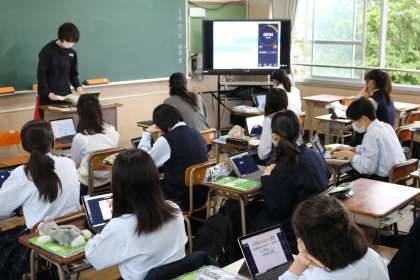 わが国の平均寿命が延びた背景や世界と日本の比較などを,個人持ちのタブレットPC(Surface Go 2)とICTソフトツールであるロイロノートを活用しながら考察し,さらにクラス全体で交流しながら深めていきました。ロイロノートを使うことで,講座の生徒全員と瞬時に意見を交流できるので,様々な場面で使用することができます。