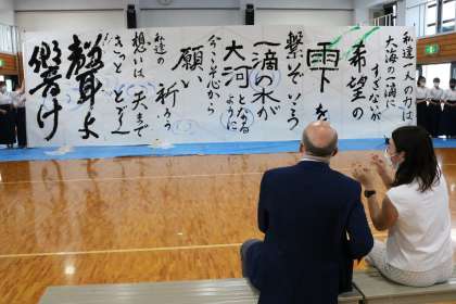 まずは,格技場にて,書道部による書道パフォーマンスを,参加生徒とともに見学いただきました。その後,アクティブラーニング室に移動し,イルマン総領事から,大使館と領事館の違いや総領事としての仕事など国際交流に関することについて,また,キャンパスフランス(フランス政府留学局・日本支局,関西オフィス)の大八木美穂様からは,フランス留学について,ご自身の経験やクイズを交えてお話しいただきました。生徒たちはフランス文化やフランスでの留学生活に興味津々で,交流会終了後も総領事を質問攻めにしておりました。