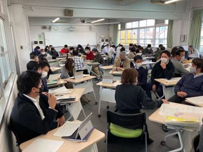 今回の研修では,はじめに新校での学びである「考える授業」について,丁寧にわかりやすく説明させてもらいました。説明後,各教科の「考える授業」の定義と具体化について,教科内でのグループワークで確認し,他教科の先生同士でペアーワークで共有と理解を図りました。その後,再度教科内のグループワークを通して,教科へのフィードバックを図り,各教科の代表の先生から「考える授業」の説明をしていただきました。